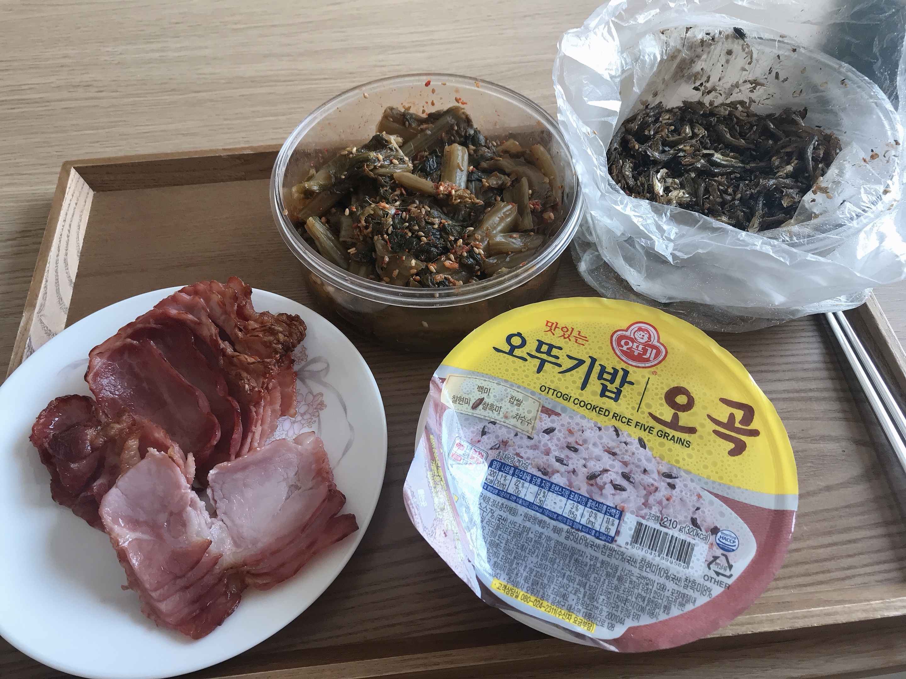 점심 : 오곡밥(320kcal), 김치(8kcal), 멸치볶음(69kcal), 베이컨(205kcal). [602kcal].