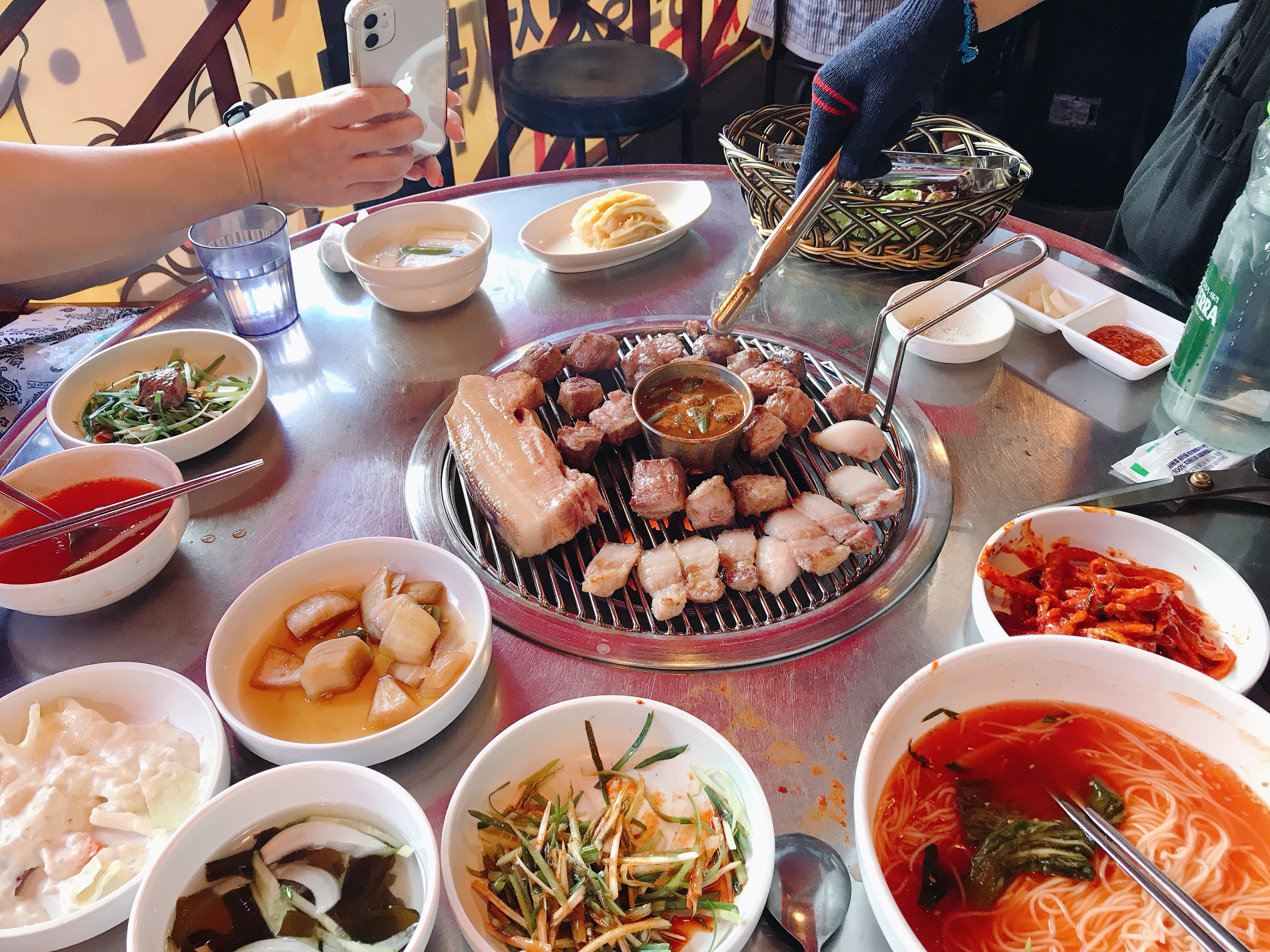 데이트, 저녁 : H은이와 "성남돈사돈"에 갔다. 열무국수(392kcal), 삼겹살 및 밑반찬((삼겹살, 2인분), 1,322kcal), 맥주(155kcal). [1,869kcal].