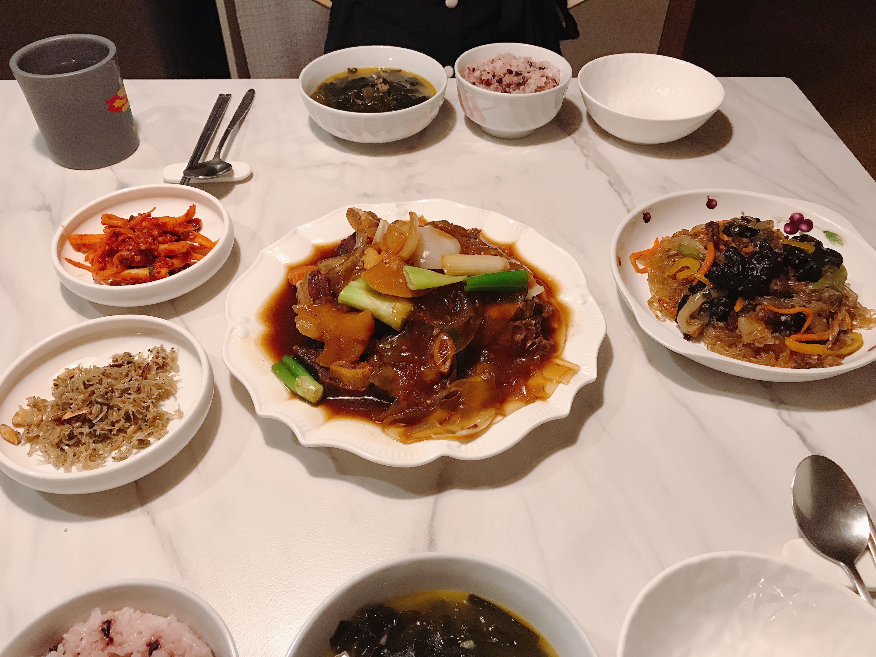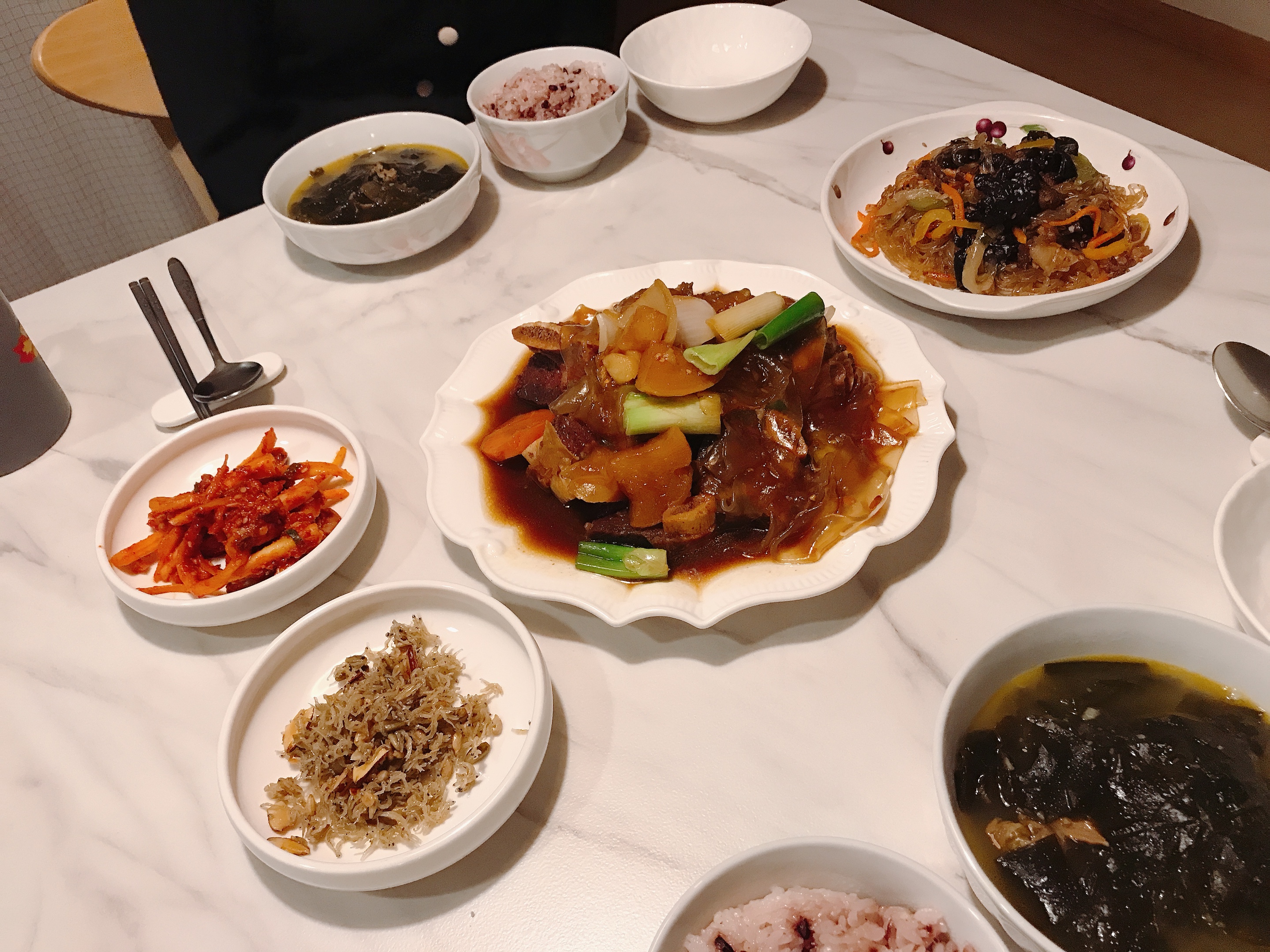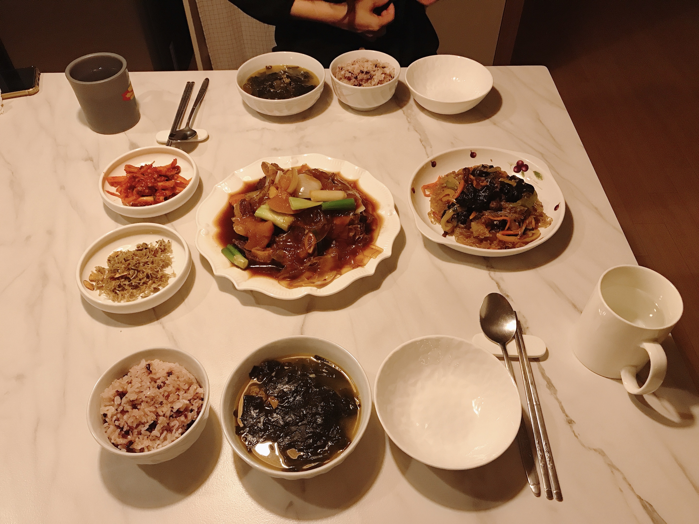 데이트, 저녁, 홈술 : H은이 생일상을 차려주었다. 소갈비찜(2인분, 1,303kcal), 잡채(285kcal), 밥(310kcal), 미역국(177kcal), 도라지무침(87kcal), 소주(0.5병, 246kcal). [2,408kcal].