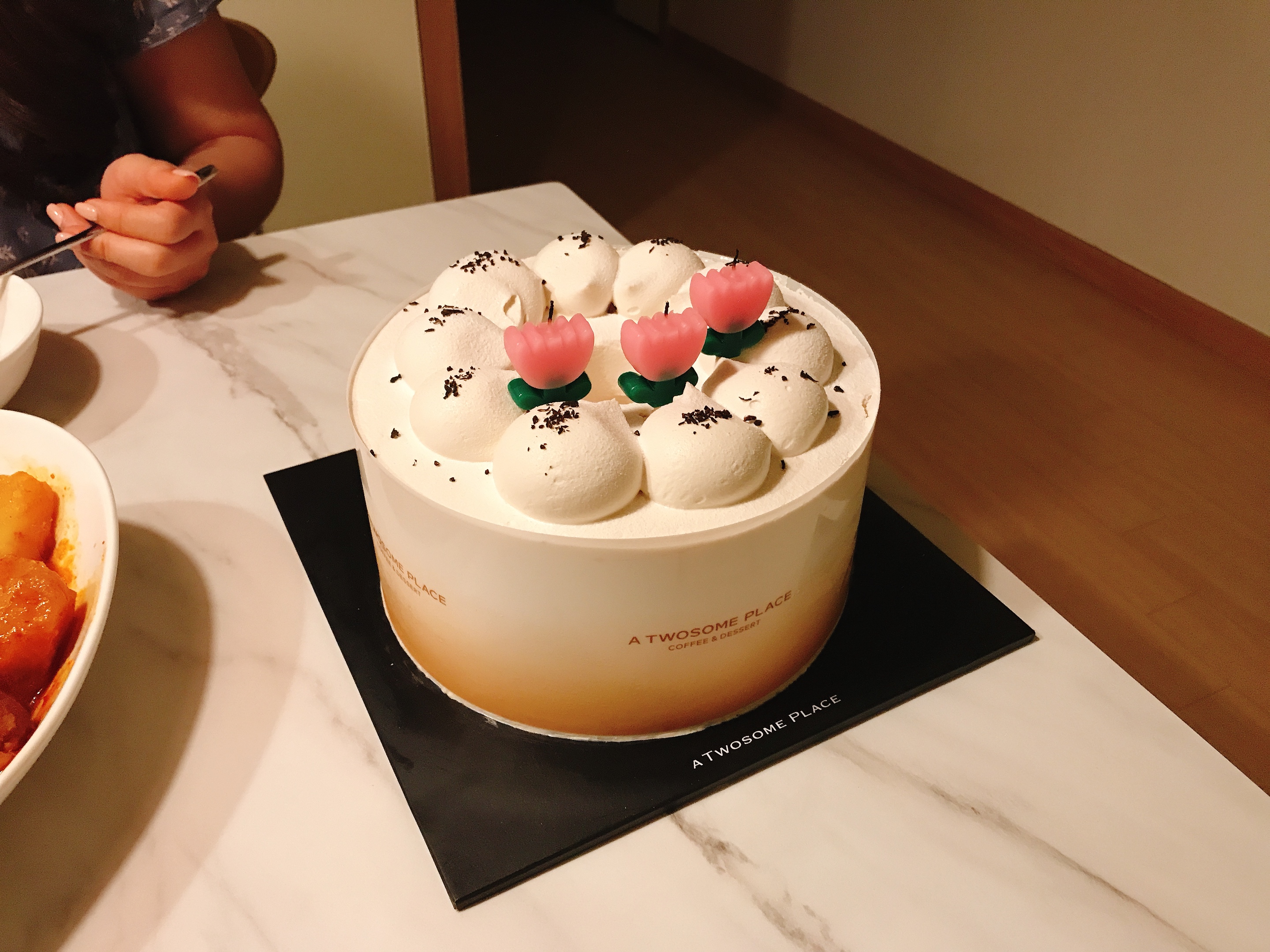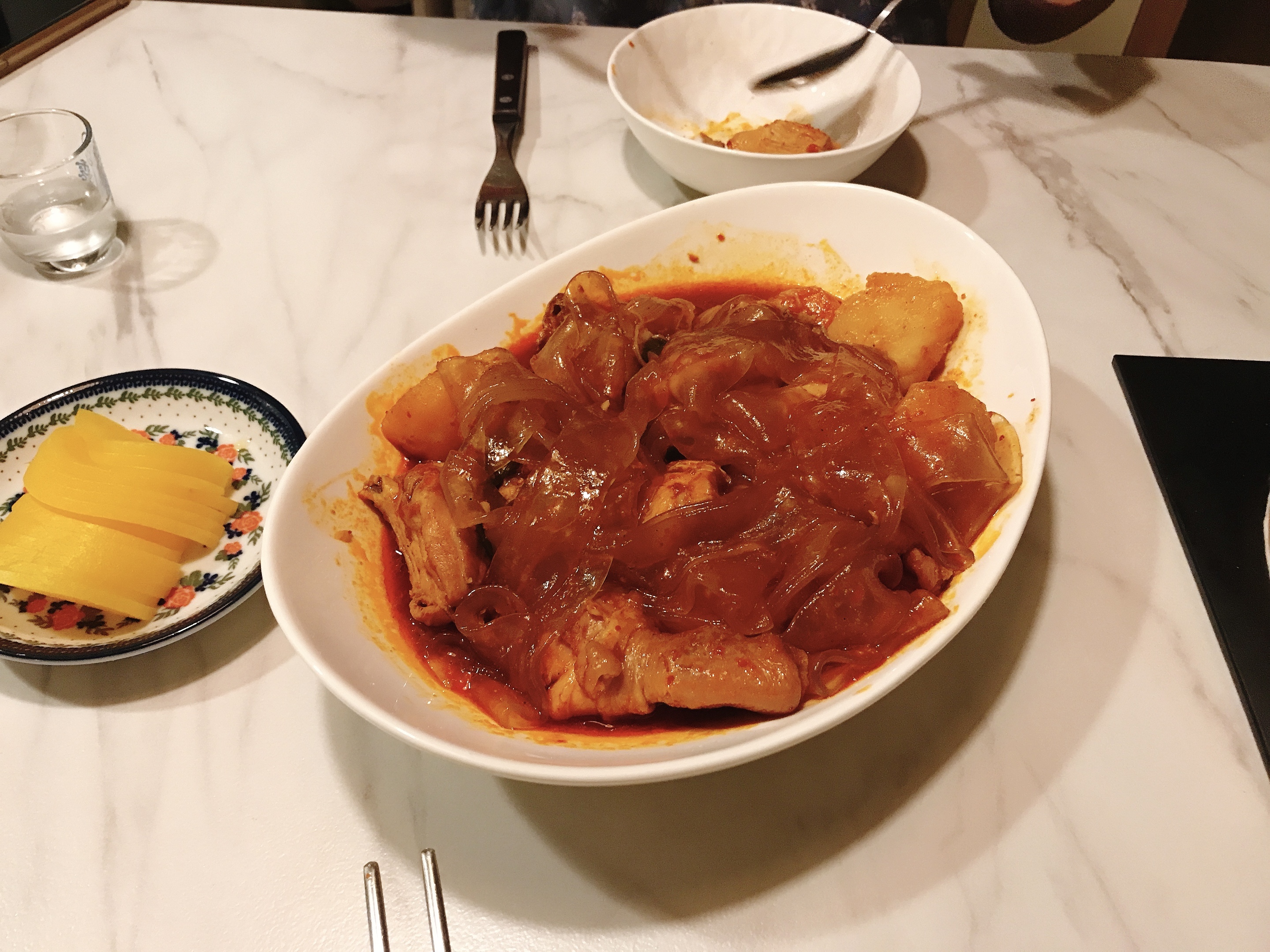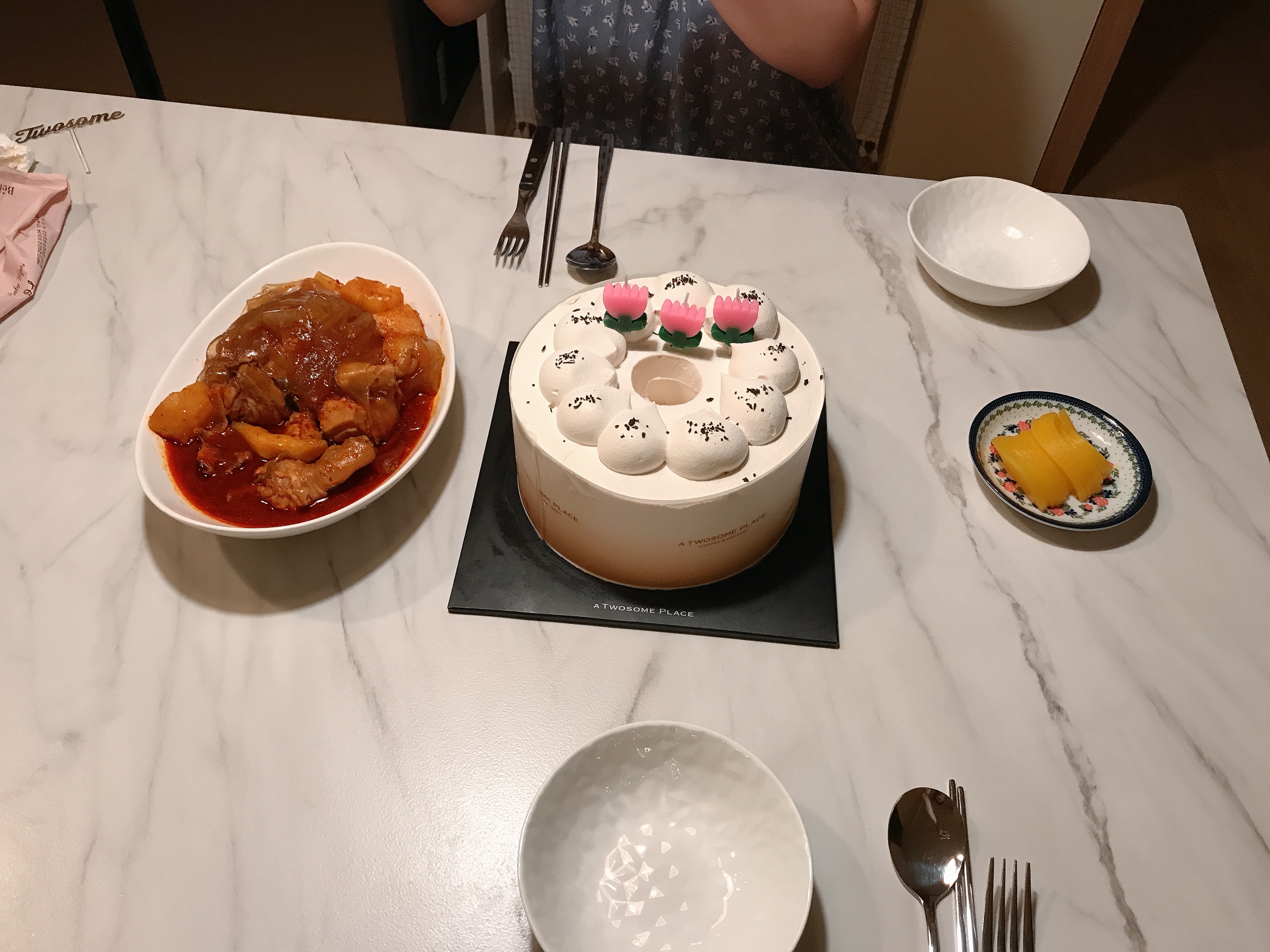데이트, 저녁, 홈술 : H은이 생일파티를 조촐하게 했다. 닭볶음탕(918kcal), 생크림케이크(2조각, 348kcal), 소주(1.5병, 737kcal). [2,003kcal].