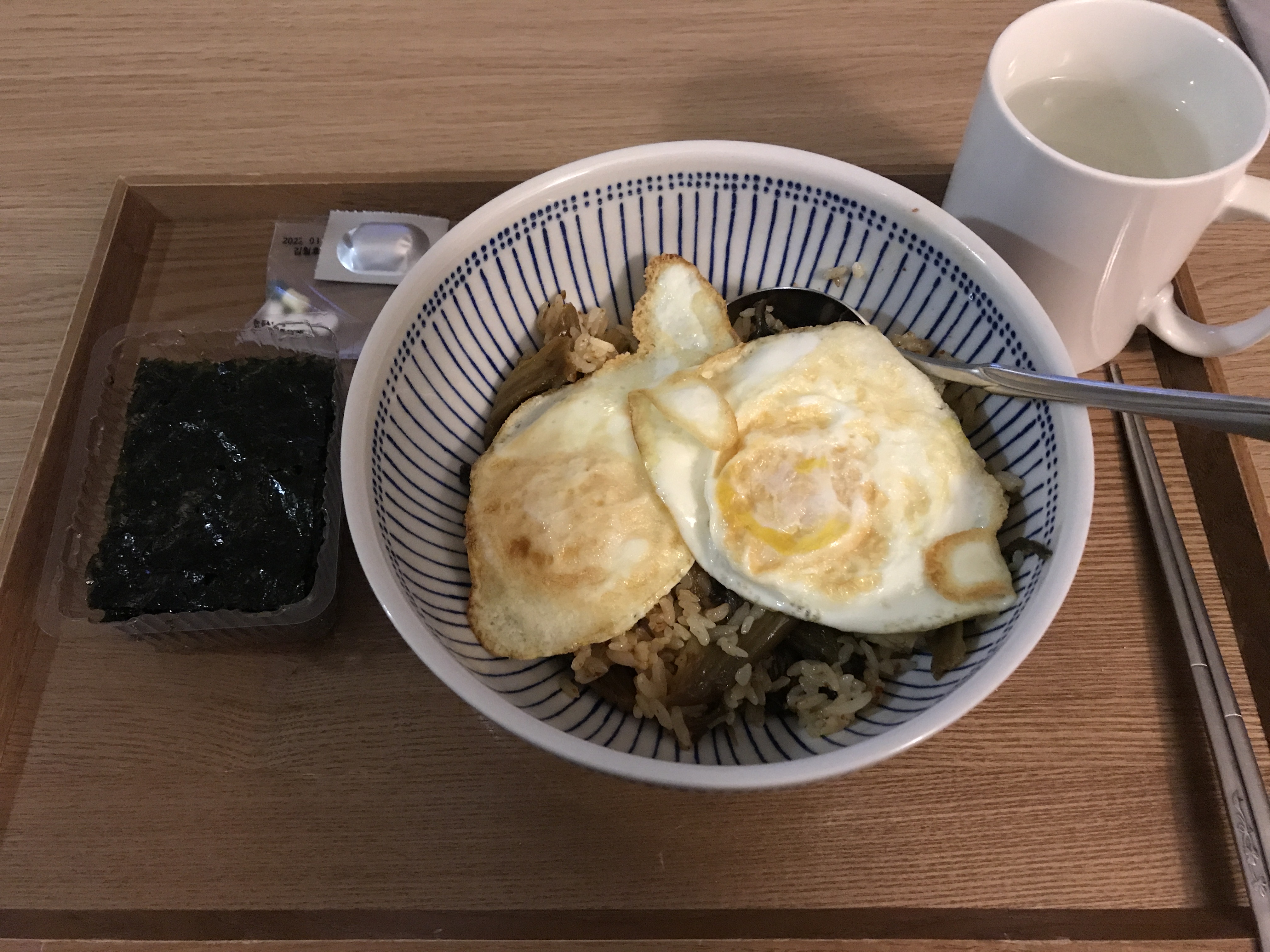 저녁 : 김치볶음밥(446kcal) + 계란후라이(2개, 178kcal), 김(30kcal). [654kcal].