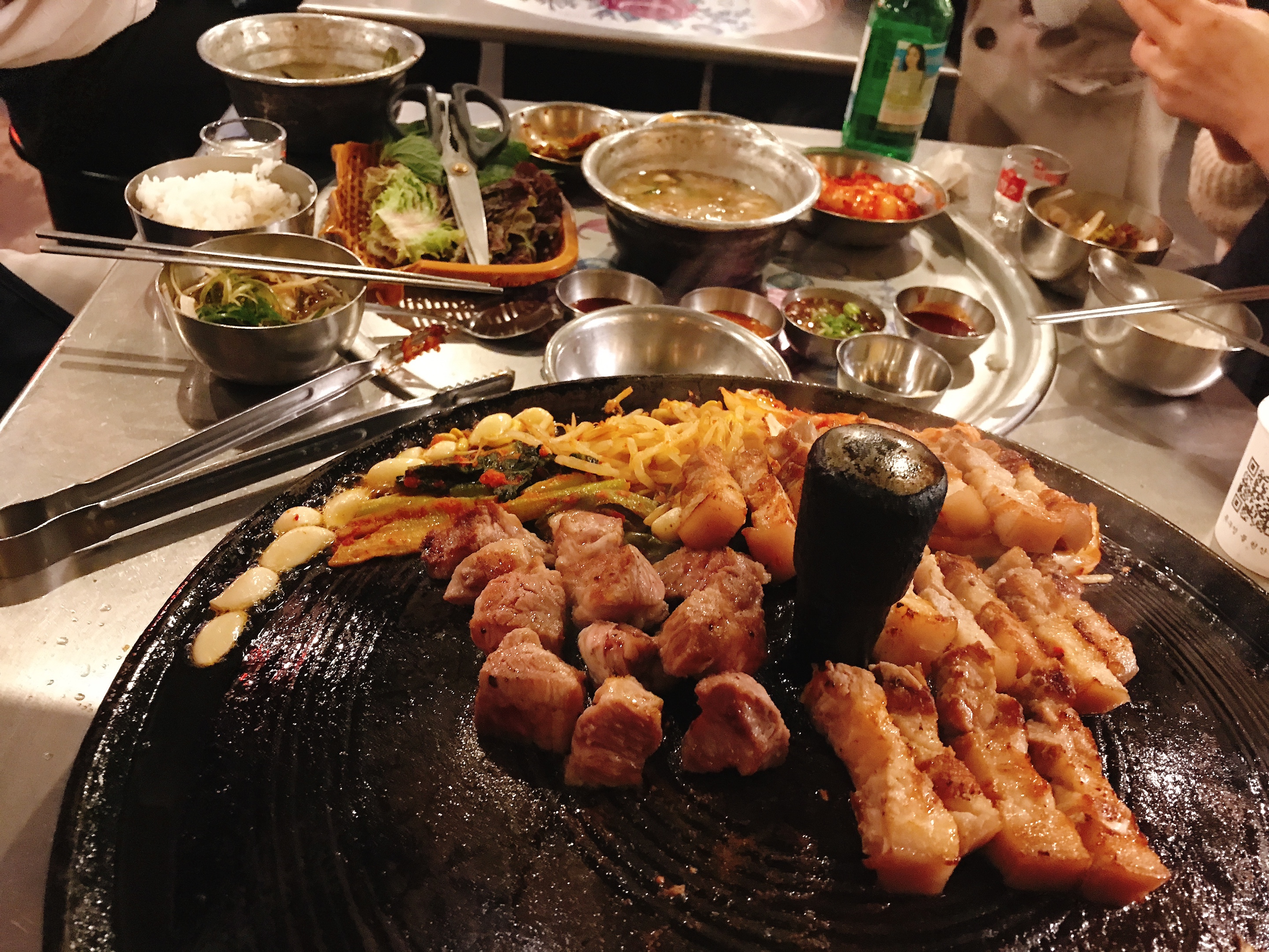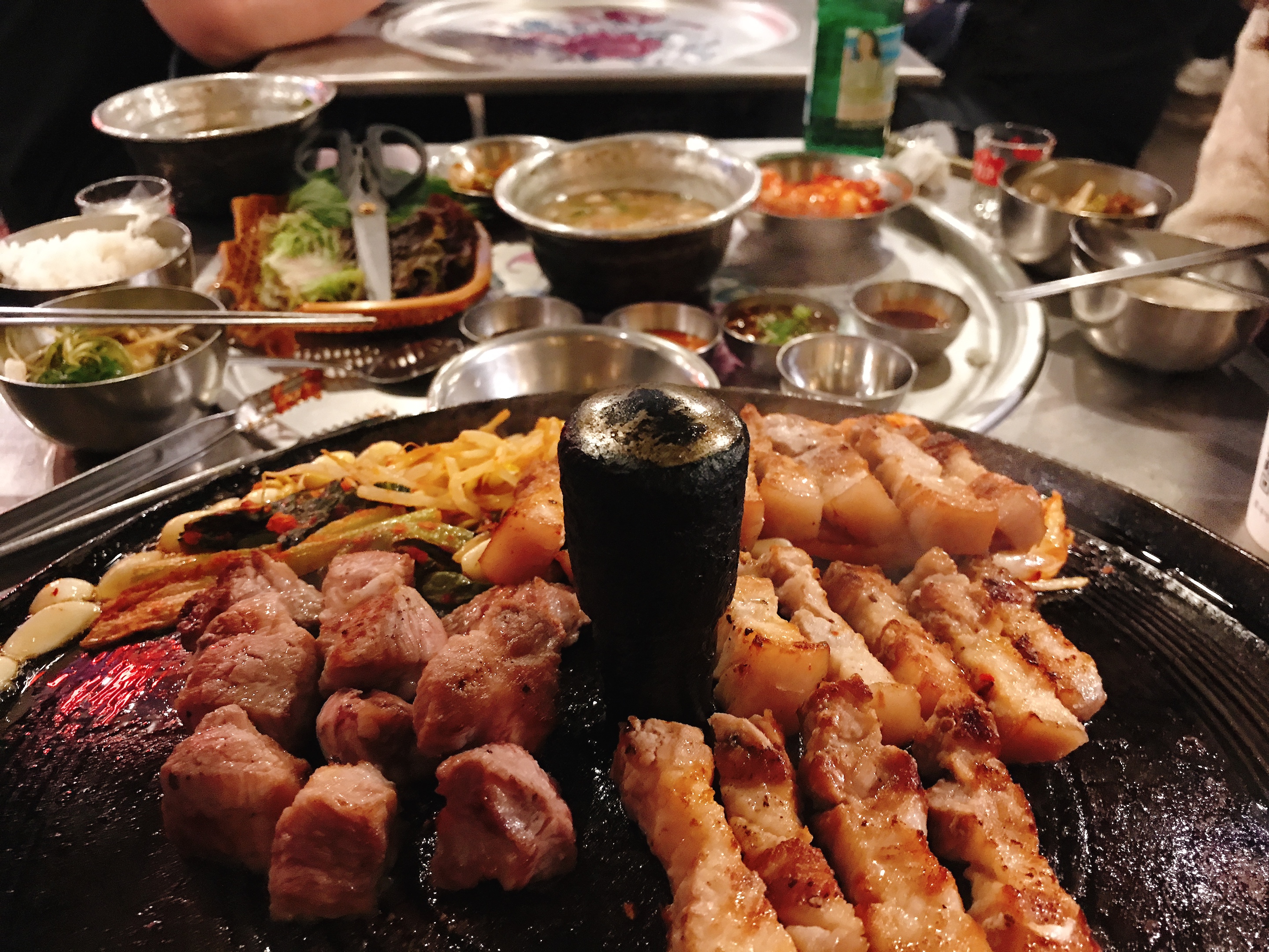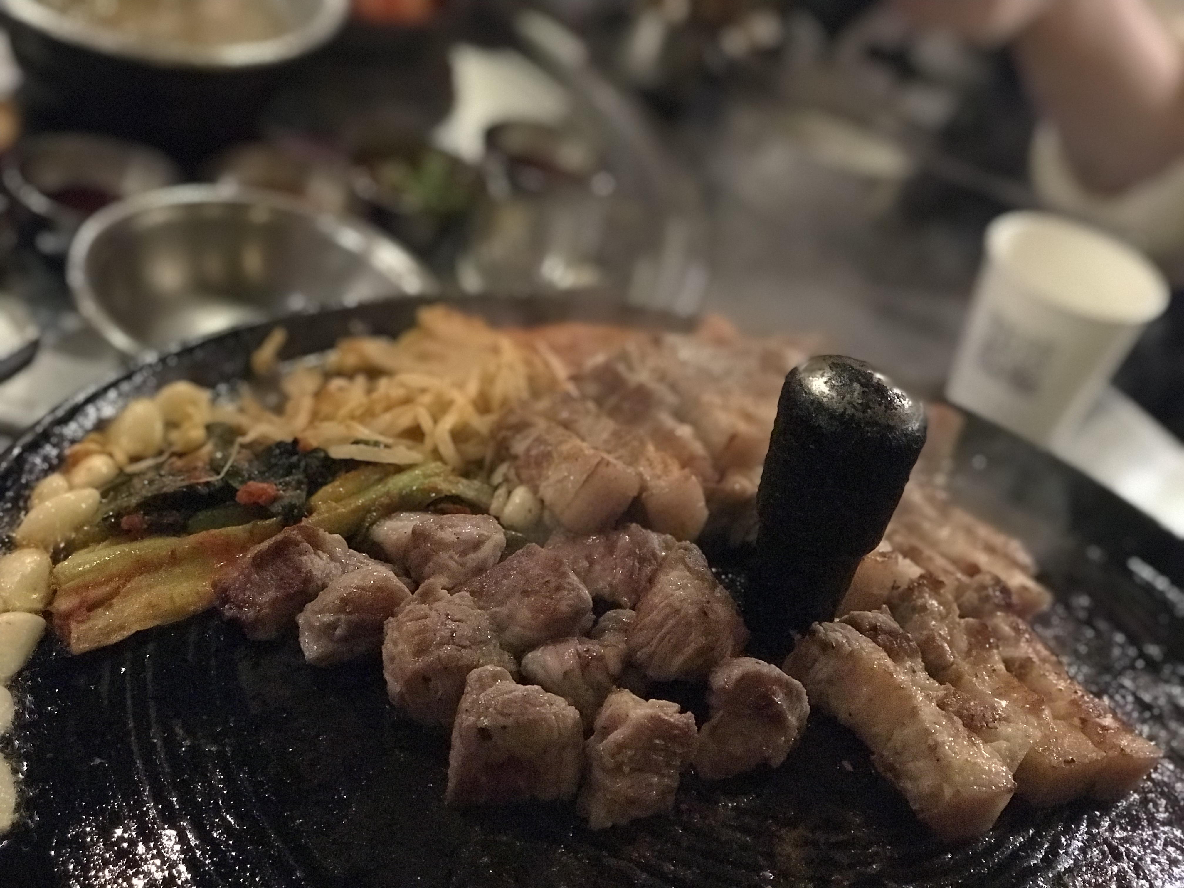 데이트, 저녁, 술자리 : H은이와 "목구멍 본점"에 갔다. 삼겹살, 목살과 반찬들(1,653kcal), 소주(2병, 982kcal). [2,635kcal].