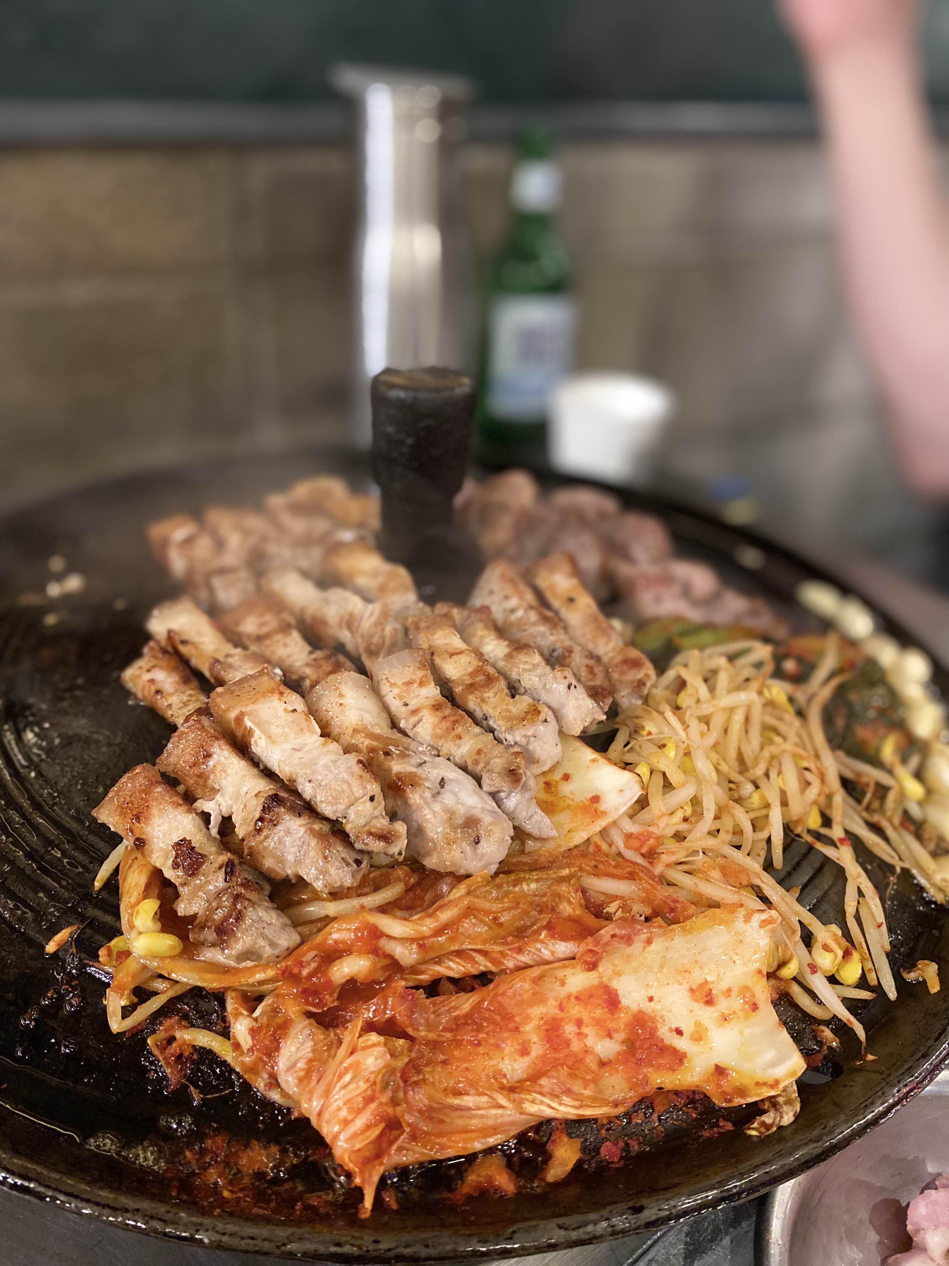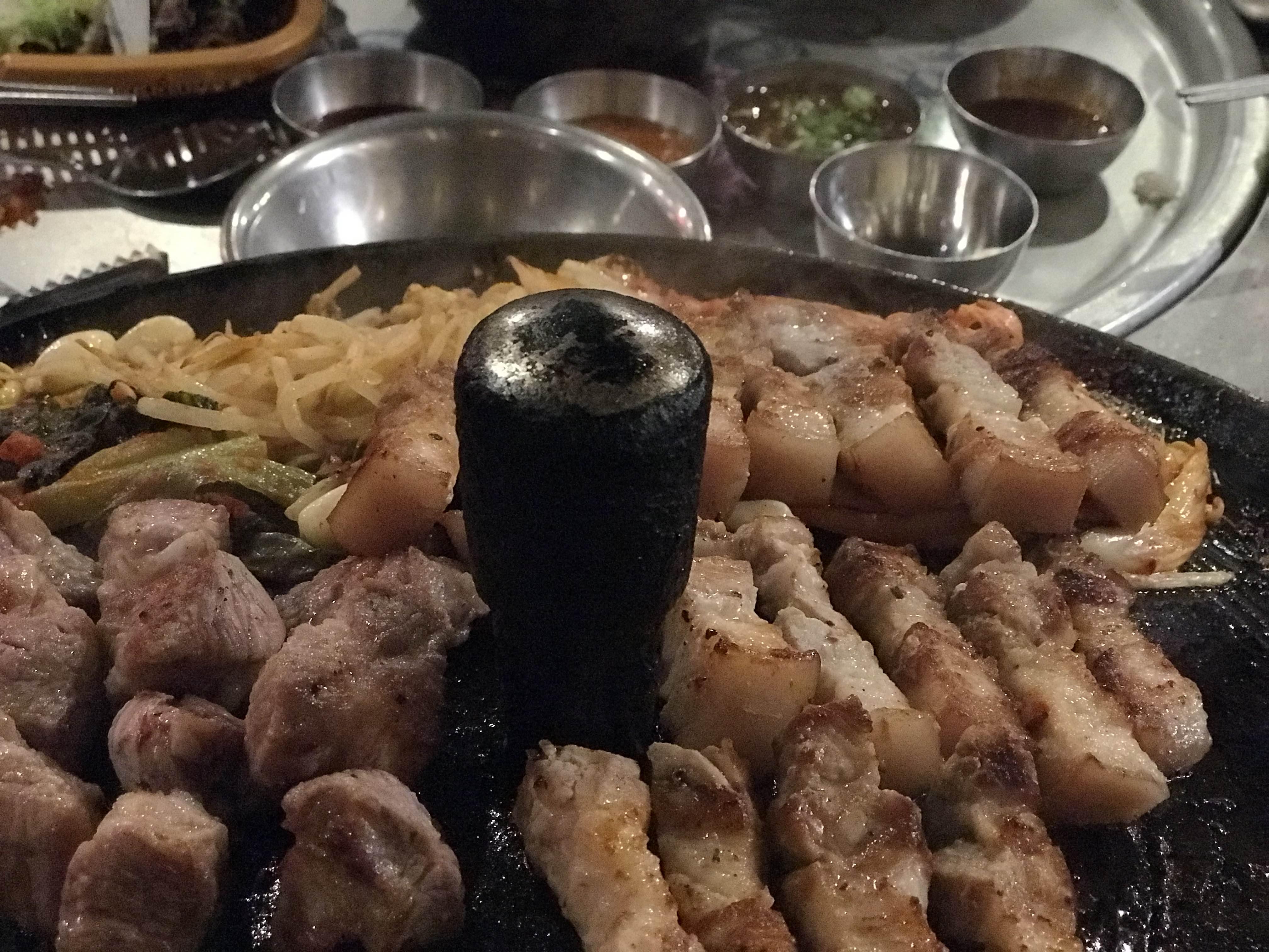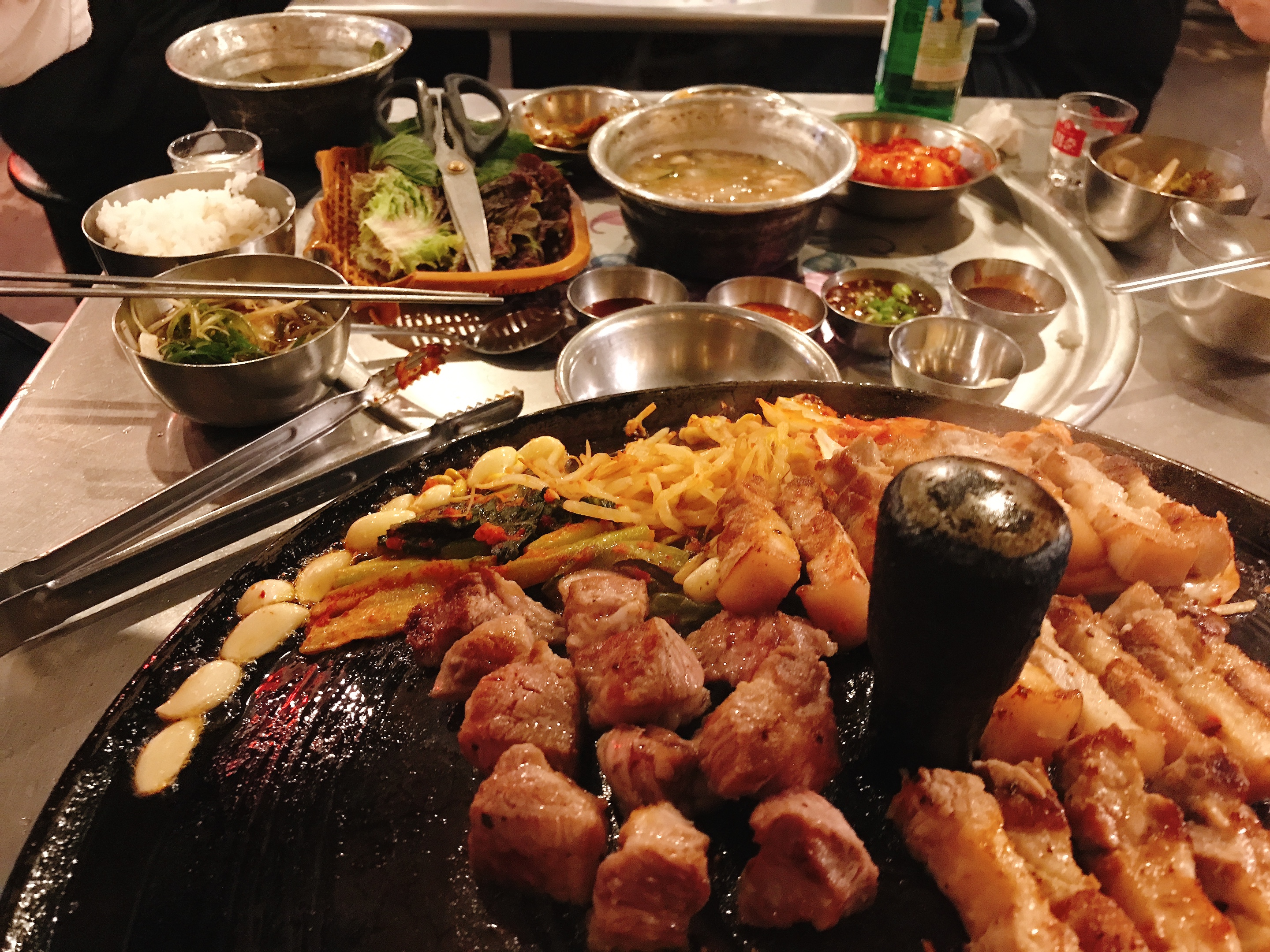 데이트, 저녁, 술자리 : H은이와 "목구멍 본점"에 갔다. 삼겹살, 목살과 반찬들(1,653kcal), 소주(2병, 982kcal). [2,635kcal].