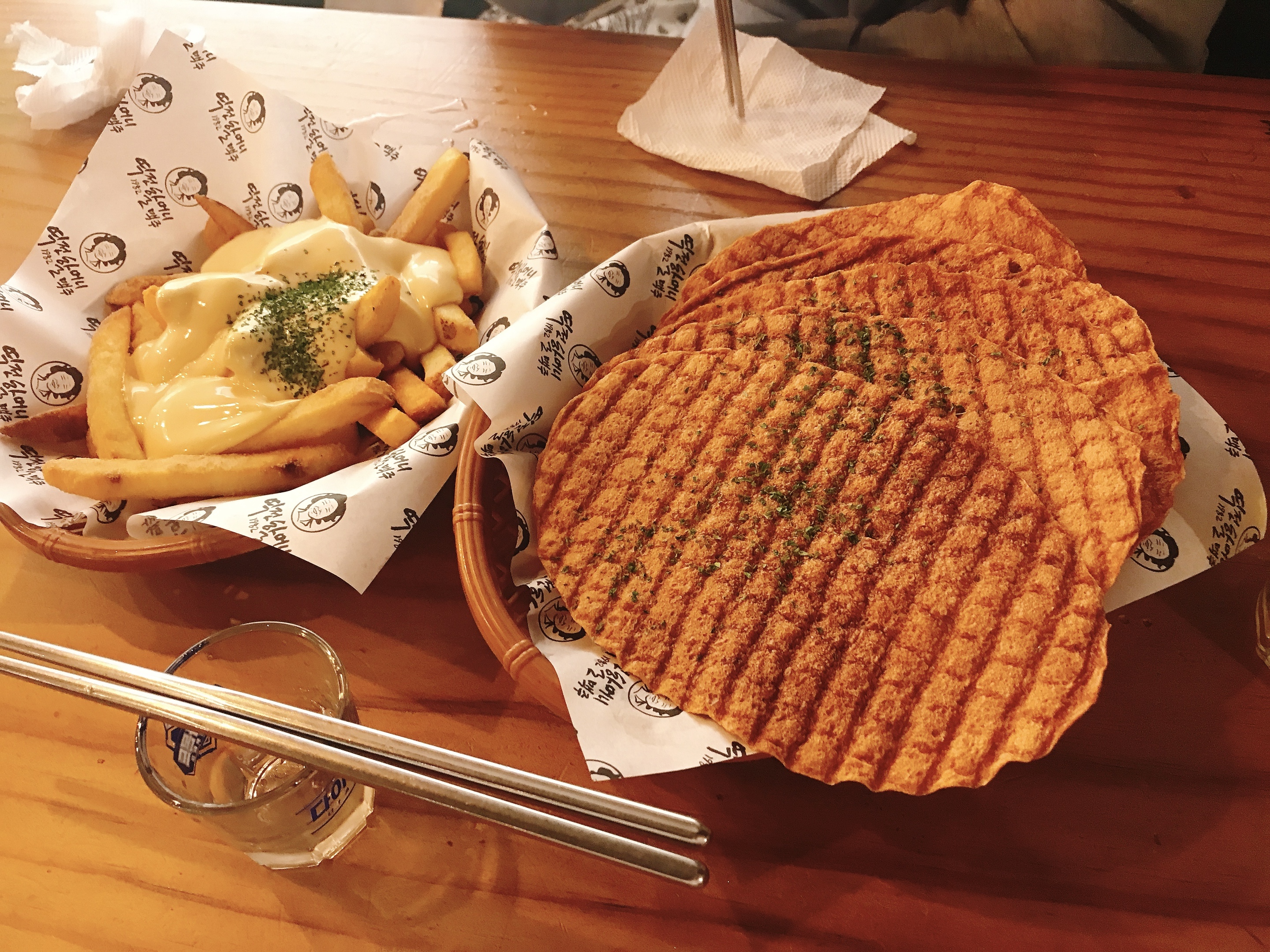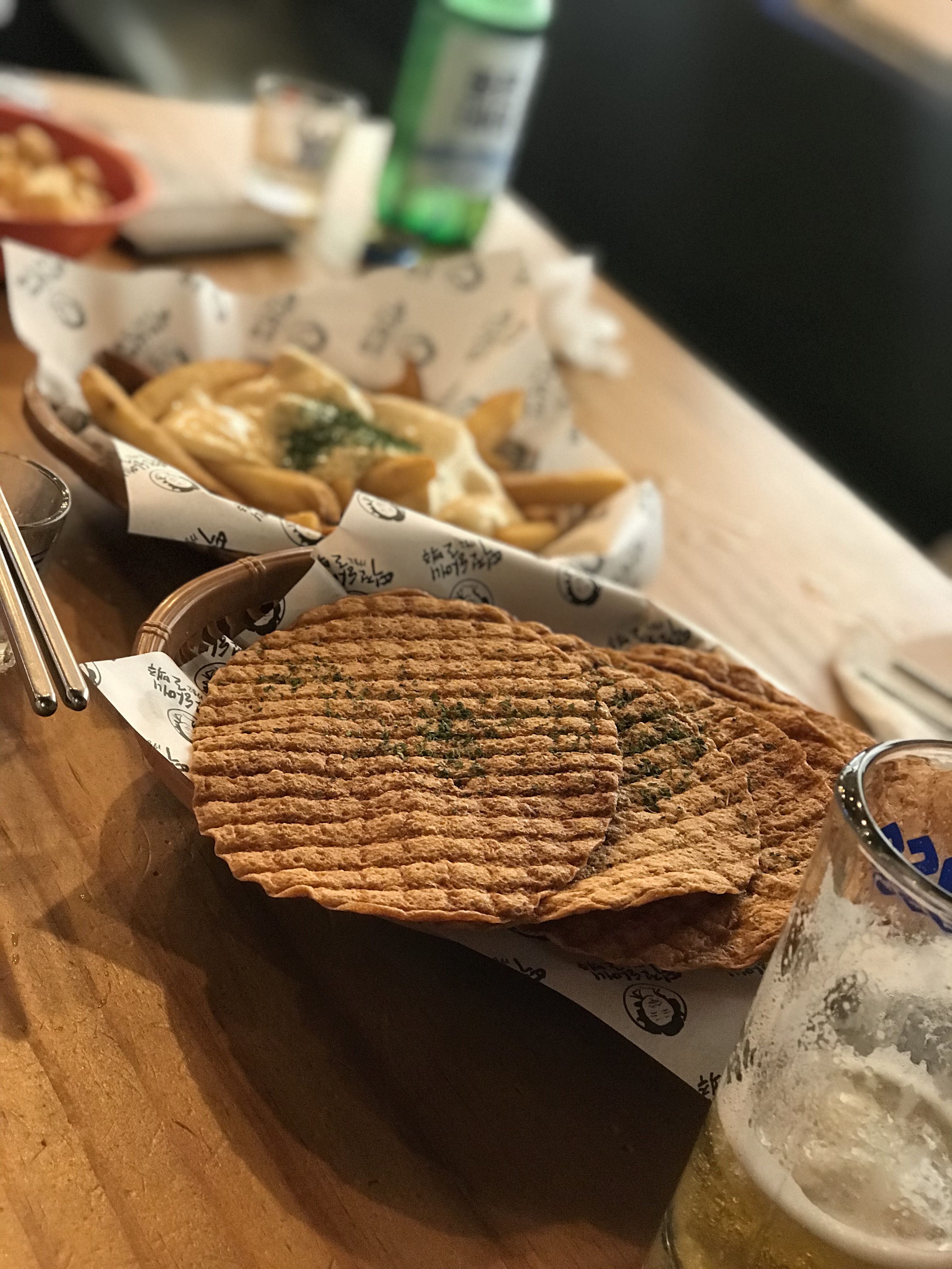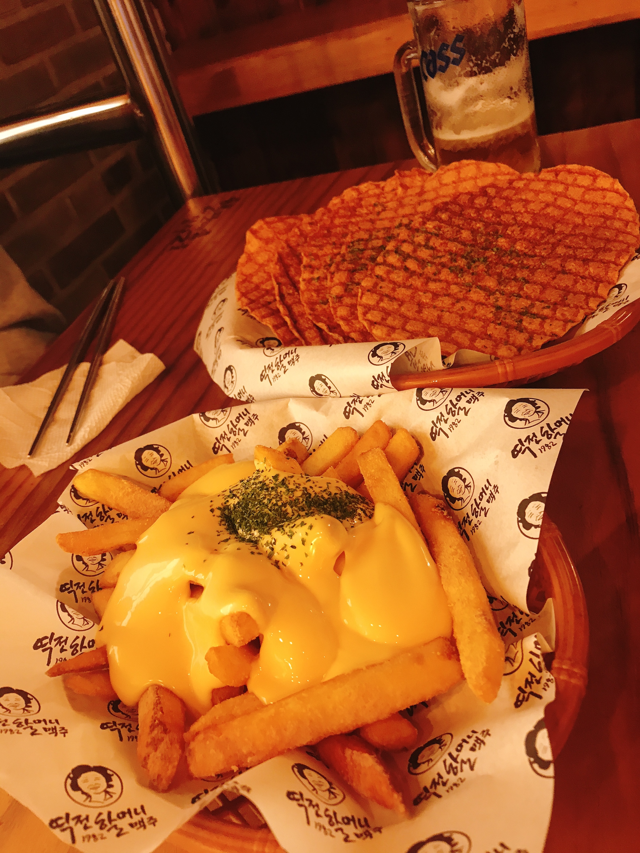 데이트, 술자리 : H은이와 "역전할머니맥주 거제아주점"에 갔다. 튀김쥐포((꾸이맨 100g), 367kcal), 갈릭빠다포테이토((감자튀김 + 치즈소스), 377kcal), 소주(1병, 491kcal). [1,235kcal].