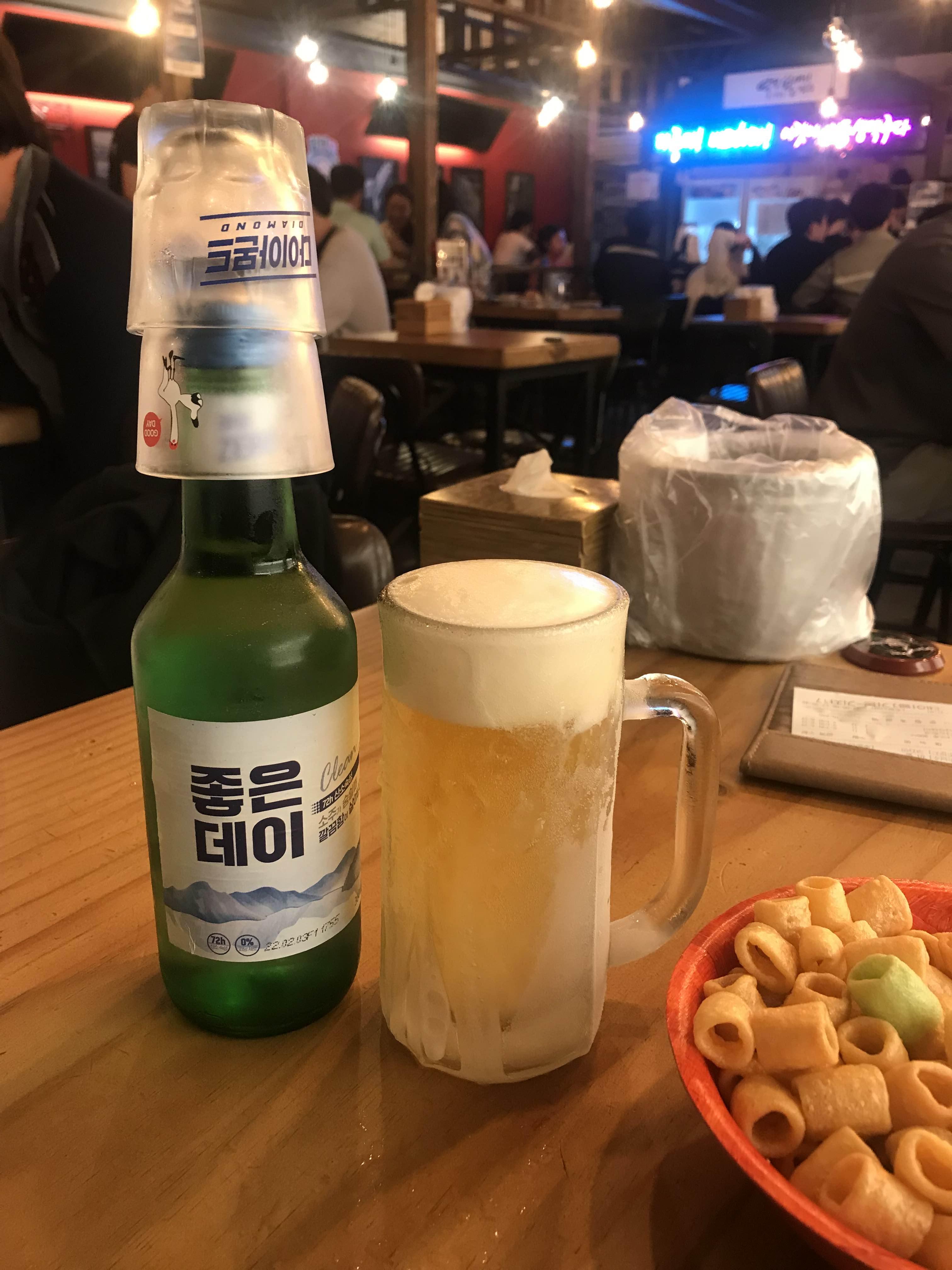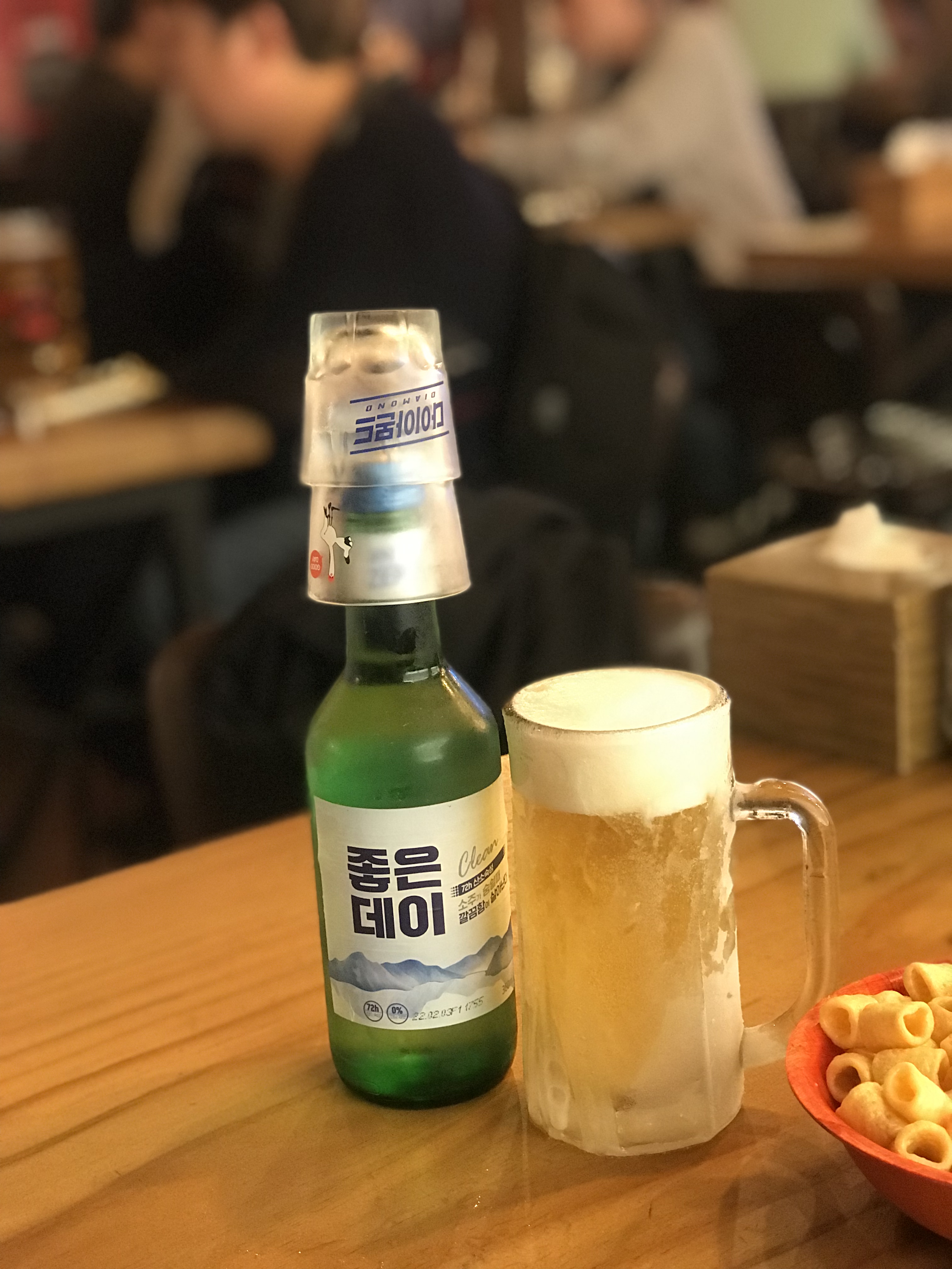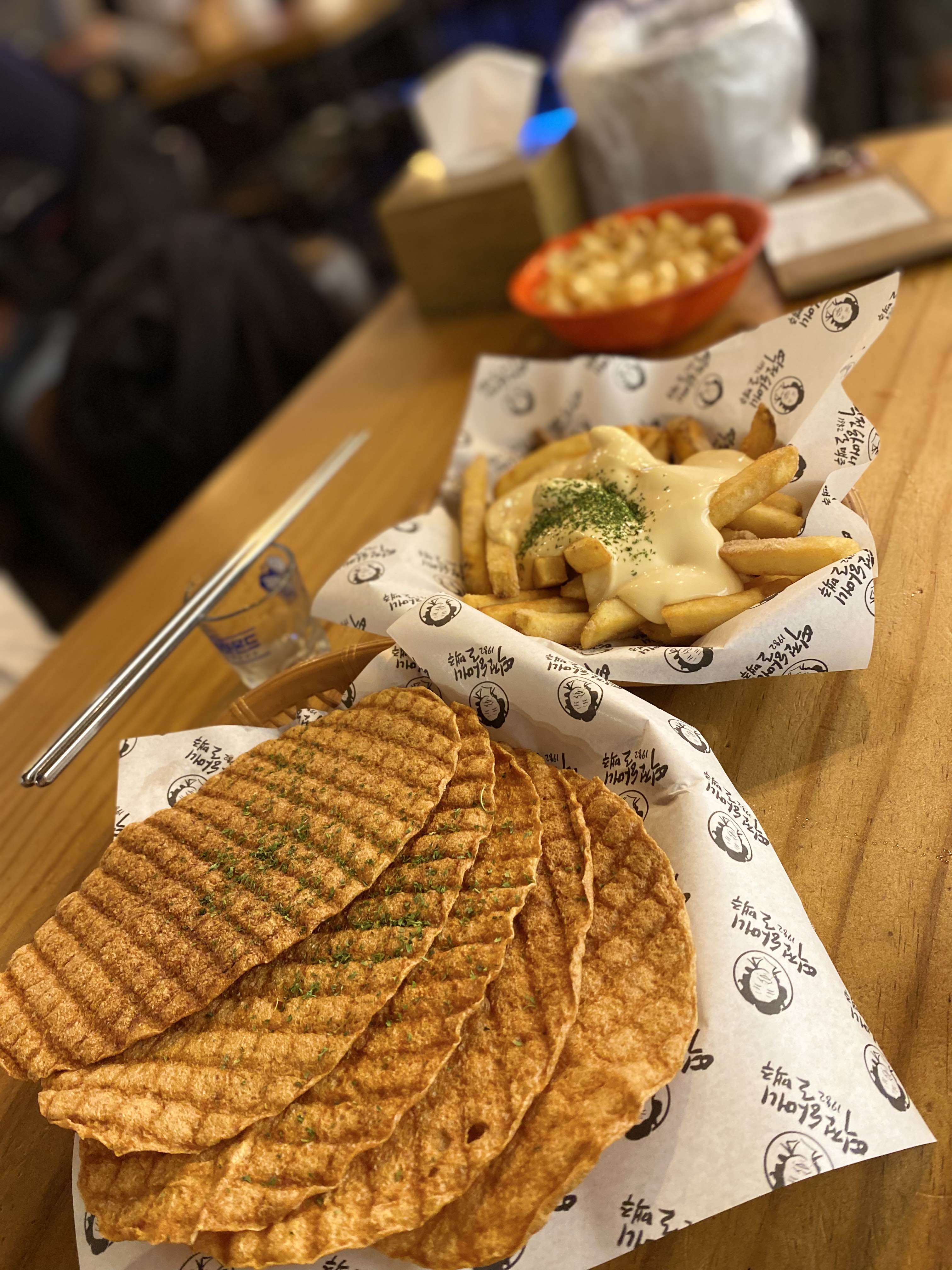데이트, 술자리 : H은이와 "역전할머니맥주 거제아주점"에 갔다. 튀김쥐포((꾸이맨 100g), 367kcal), 갈릭빠다포테이토((감자튀김 + 치즈소스), 377kcal), 소주(1병, 491kcal). [1,235kcal].